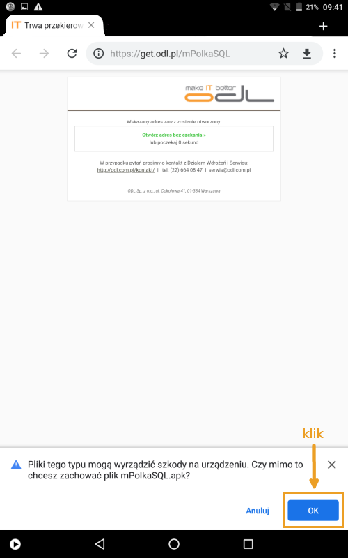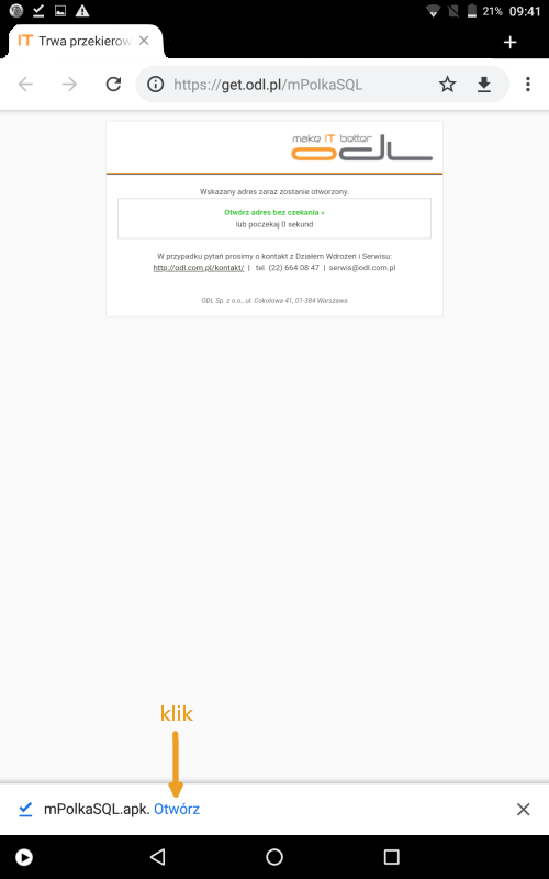2. Kod QR zawiera link HTTP. Otwórz do w przeglądarce. Po chwili rozpocznie się pobieranie pliku mPolkaSQL.apk.